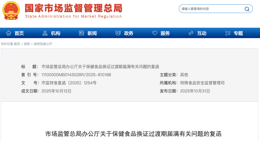 《廣東省市場(chǎng)監(jiān)督管理局關(guān)于請(qǐng)求明確“無有效期和無產(chǎn)品技術(shù)要求”保健食品過渡期屆滿后未換證有關(guān)問題的函》(粵市監(jiān)食特函〔2025〕1091號(hào))收悉。經(jīng)研究,現(xiàn)函復(fù)如下: